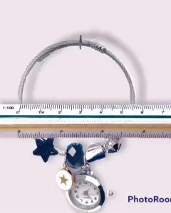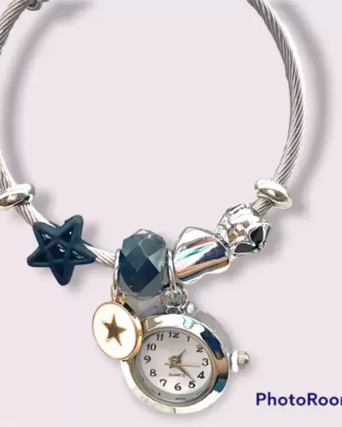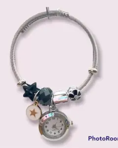 Pulsera con charms de estrella y reloj. Pulsera ajustable a la muñeca con 9 charms diferentes y reloj funcional Muy linda y cómoda para uso diario