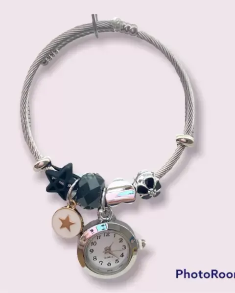 Pulsera ajustable a la muñeca con 9 charms diferentes y reloj funcional Muy linda y cómoda para uso diario