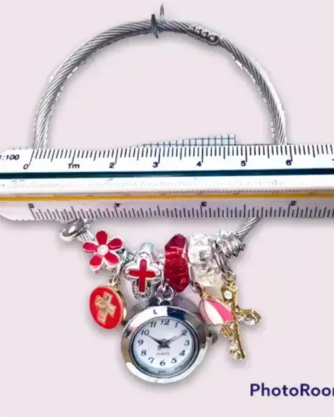 Pulsera con charms rojos y reloj. Pulsera ajustable a la muñeca, con 9 charms diferentes y reloj funcional
