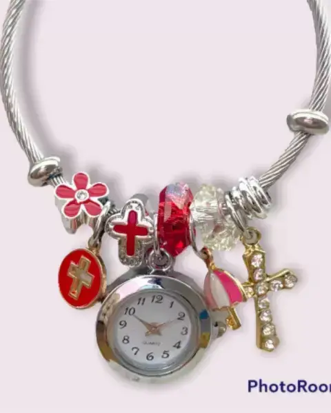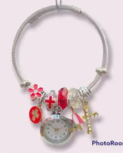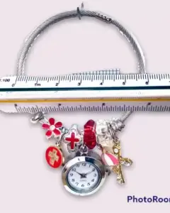 Pulsera ajustable a la muñeca, con 9 charms diferentes y reloj funcional