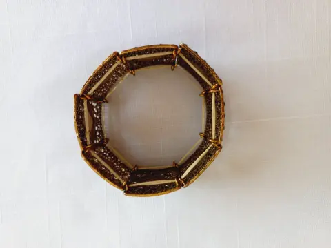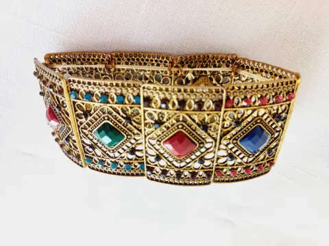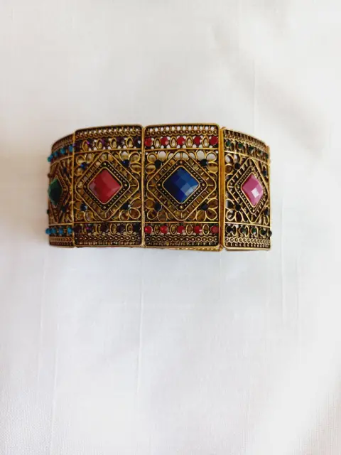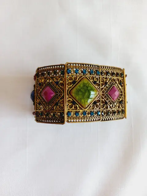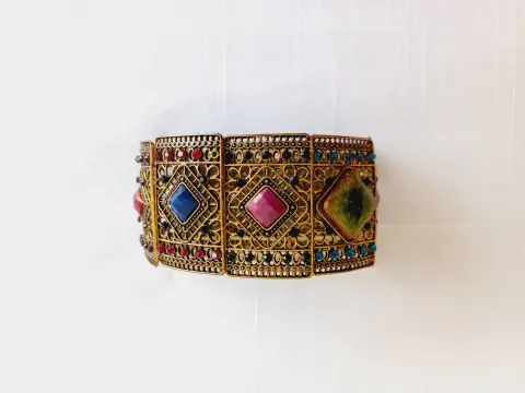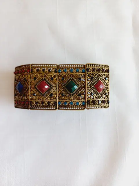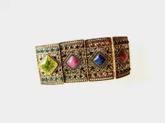 Pulsera con pedrería. Bonita pulsera de resorte con placas en grabado de flores y detalles de pedrería