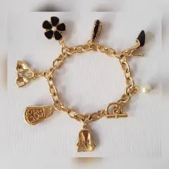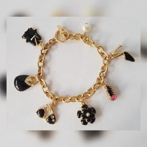 Pulsera eslabones forzados tono DORADO modelo "Lady", c/múltiples dijes esmaltado NEGRO/DORADO c/aplique circonias y cierre p/gancho barra. Dimensiones cms: 18 largo. Aleación de zinc.***EL ESMALTADO DE LOS DIJES ES MUY BELLO Y NO LO CAPTAN LAS FOTOGRAFÍAS***