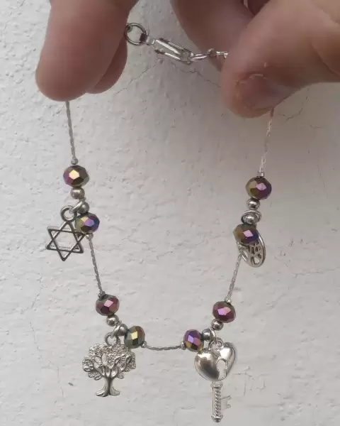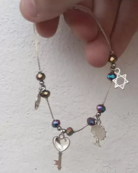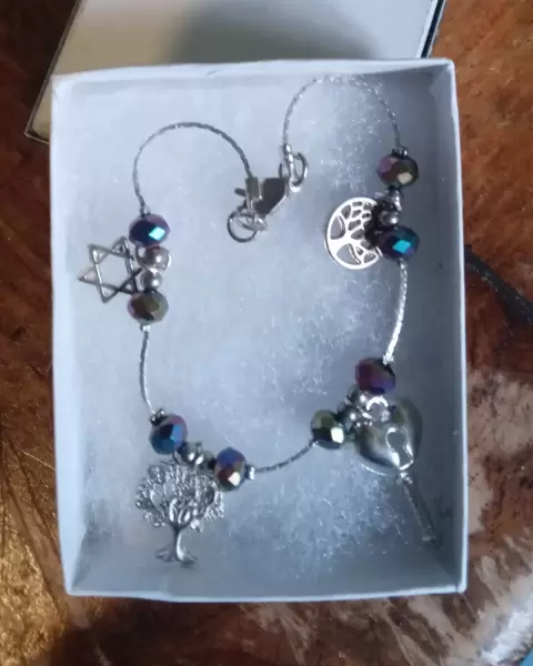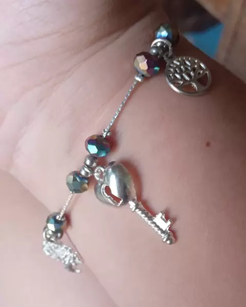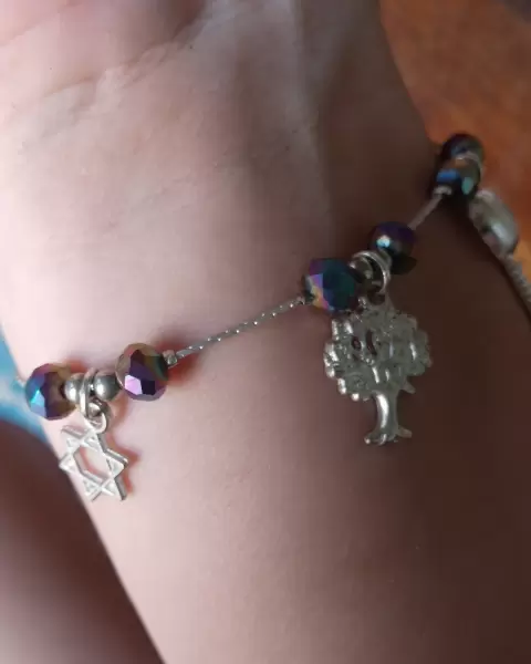 Pulsera, acero inoxidable, con dijes de arbol de la vida, estrella, llave, arbol, y bolitas tornasol, se ve super linda y delicada, excelente calidad, en verdad esta hermosa.Funciona como proteccion.