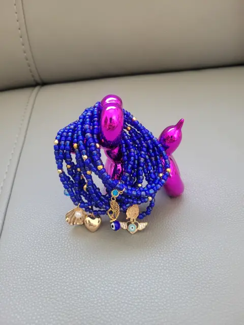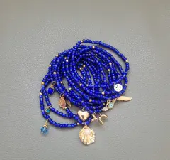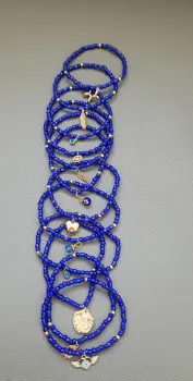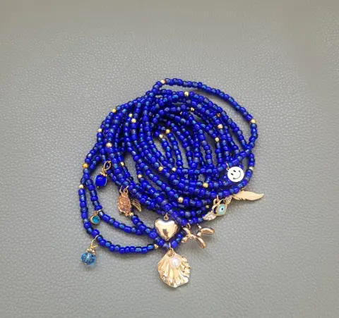 Hermoso juego de 12 pulseras en chaquiras de color azul; con dijes y cuentas en chapa de oroy acero inoxidable color dorado