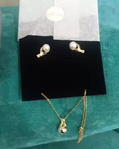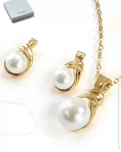 Set collar y aretes de perlas. 💎💎Hermoso Collar tono dorado con cadena ajustable y colgante de perla blanca de cristal incluye aretes del mismo modelo 💎💎Empaque tipo cajita de regalo 🎁Marca oriflame