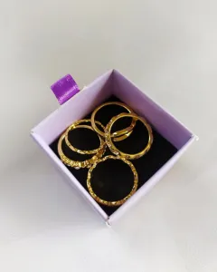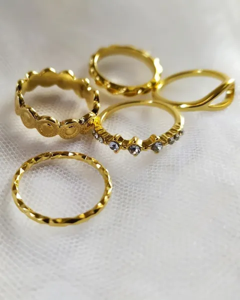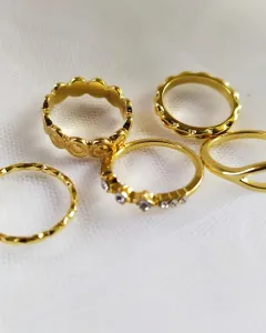 Set con 5 anillos de distinto diseño. Baño de oro de 18K. Talla 7. Uno tiene pequeños brillantes. Marca Victoria Zolassi originales.