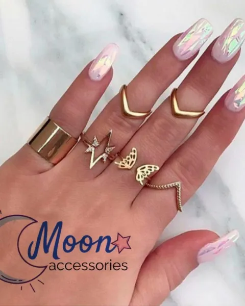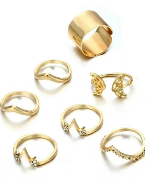 Set de 7 Anillos dorados mariposa. Set de 7 Anillos dorados con pedrería de diferentes diseños. Aleación de zinc