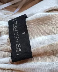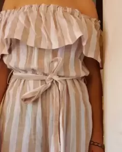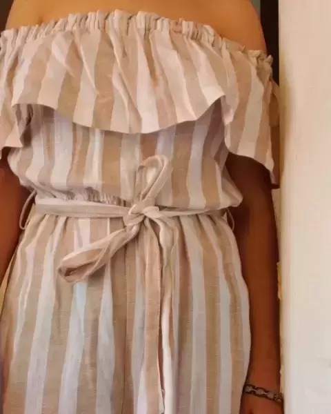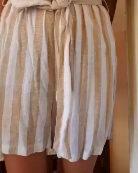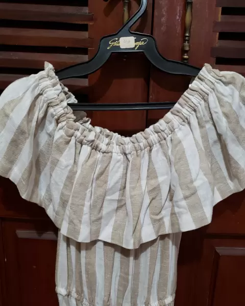 Conjunto de tela color cremita con blanco. Jumper de tela gruesa, es fresco y bonito, llega arriba de la rodilla, descubierto de los hombros
