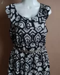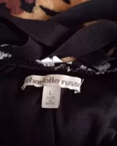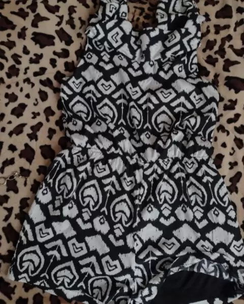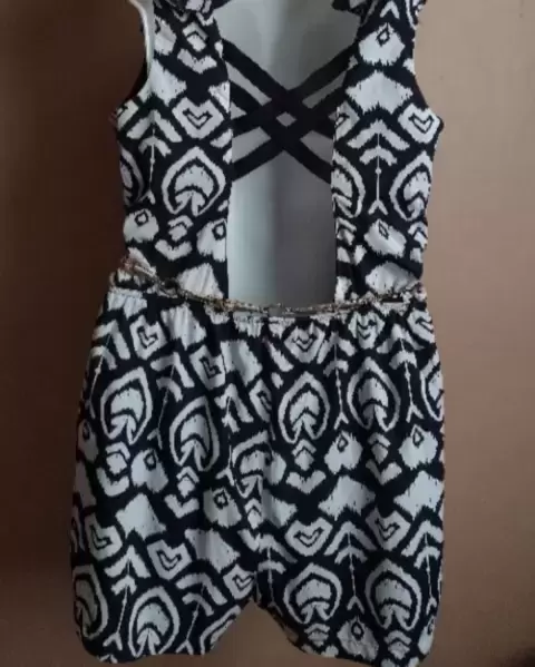 Es un chors Jumpsuit muy bonito , de color negro con estampado blanco , talla L , elástico en la cintura y escote en La espalda , se uso un rato , sin detalles 👌