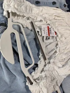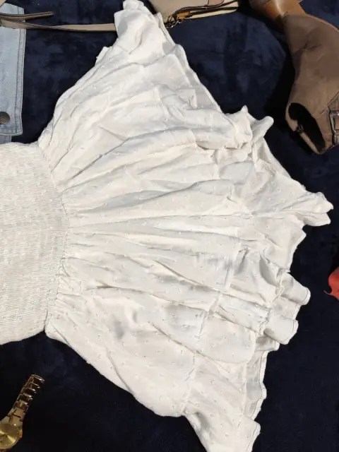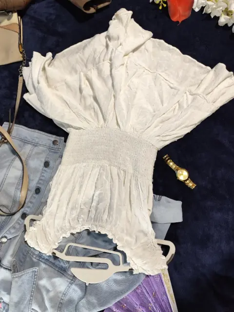 Precioso Jump blanco, con olanes en el Short. Tela fresca, cintura totalmente elástica, con textura (flores pequeñas). Corte campesino en mangas, con elástico para mejor ajuste al pecho. Está precioso. Chico, posible M.