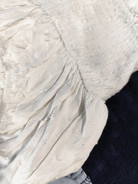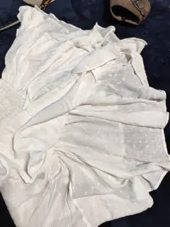 Jump con olanes. Precioso Jump blanco, con olanes en el Short. Tela fresca, cintura totalmente elástica, con textura (flores pequeñas). Corte campesino en mangas, con elástico para mejor ajuste al pecho. Está precioso. Chico, posible M.