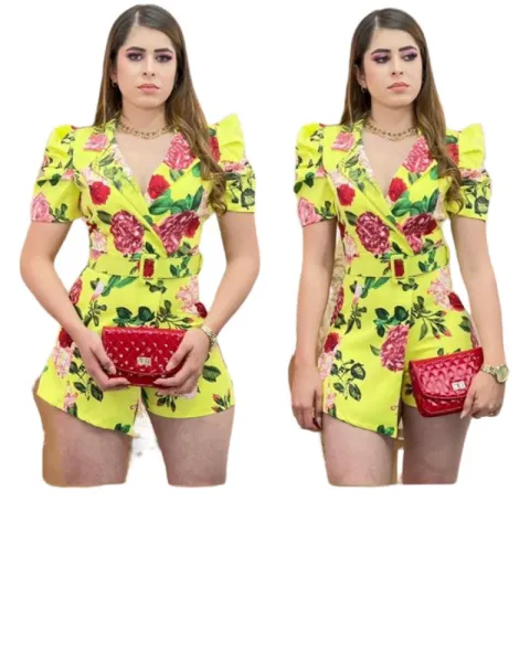 Jumper Amarillo Con Estampado De Flores. Jumper de short falda con cierre en el costado, la tela es estampado de flores incluye cinturón de la misma tela