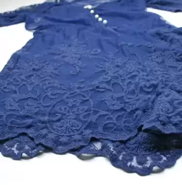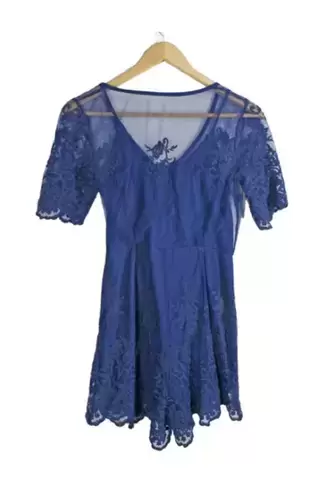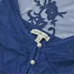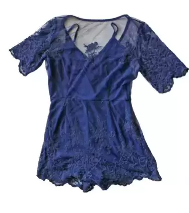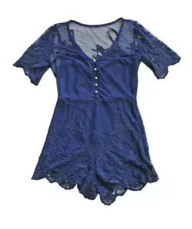 Jumper azul marino de short Talla S. Jumper azul marino de short, tiene tela transparente con tipo encaje y trae forro con tirantes, al frente tiene botones de perlas súper lindo y fresco para la temporada.