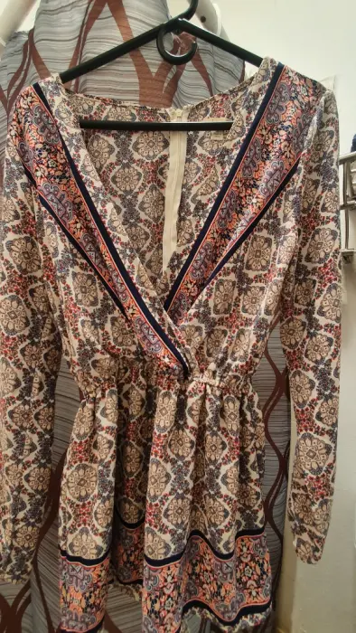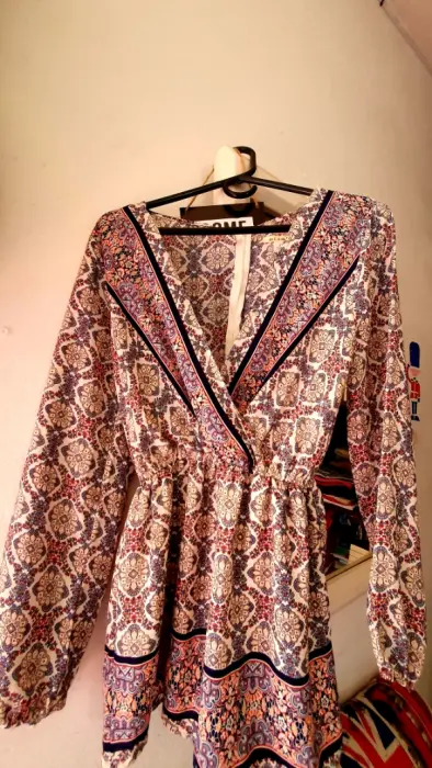 Hermoso jumper super bonito tela delgada forro en parte short escote en V con botón opcional discreto, manga larga tela diseño en color crema , con resorte pequeño en la cintura . Talla S queda perfecto M marca a i mor .