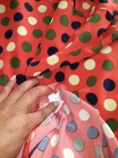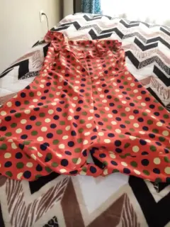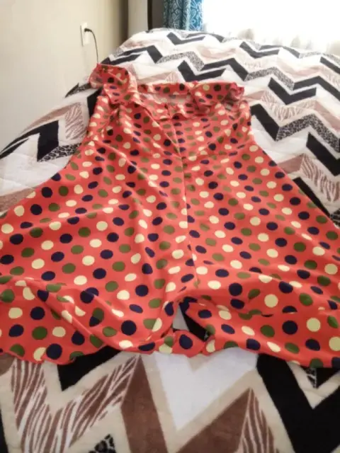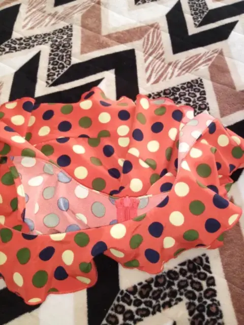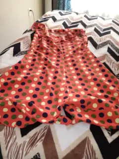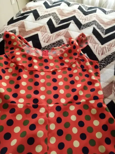 Es de lunares de colores, tiene cuello redondo con olan en el cuello, sin manga, el short esta muy amplio y tiene olan en la parte de abajo, tuene cierre por atras es tela ligera