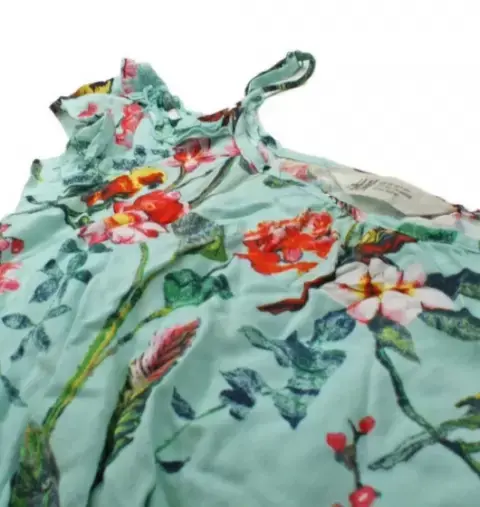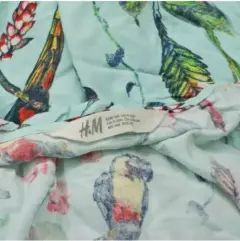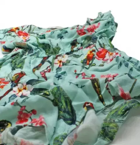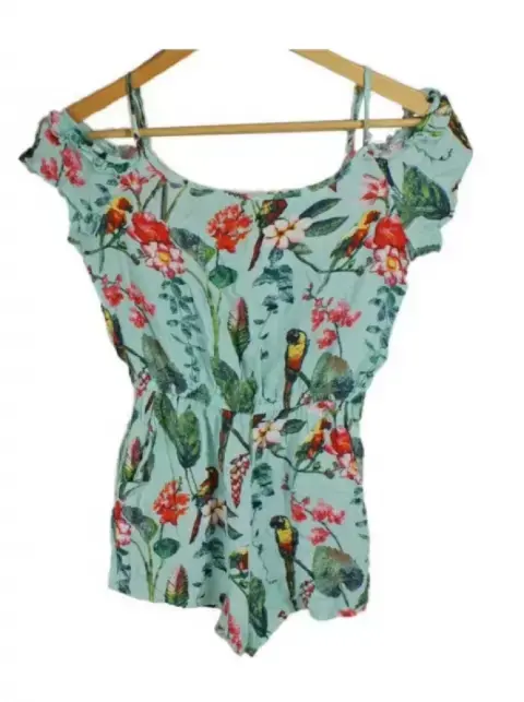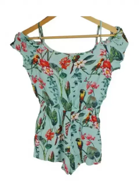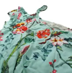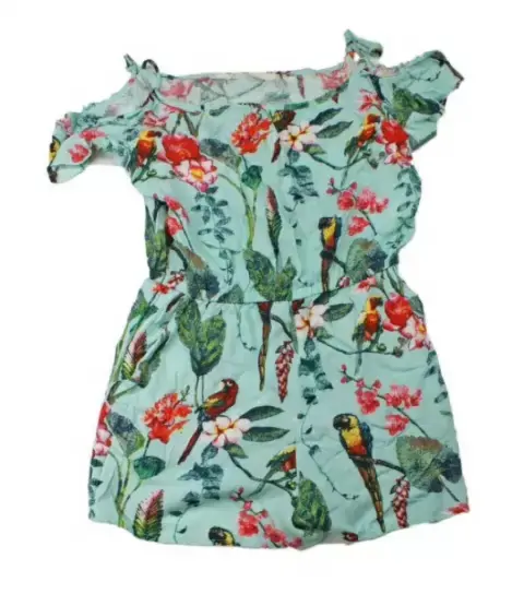 Jumpsuit azul con flores, hojas y pájaros de niña talla 9-10. De la marca H&M con olanes en los hombros. Manga corta muy lindo e ideal para primavera verano.