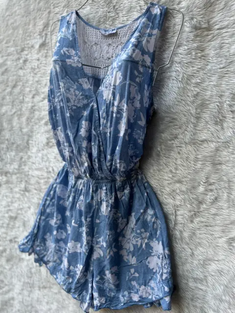 Jumpsuit sin mangas color azul claro con flores blancas, fresco, con encaje en espalda y holanes en short, ideal para esta temporada de verano 💙🦋