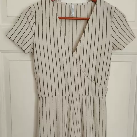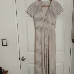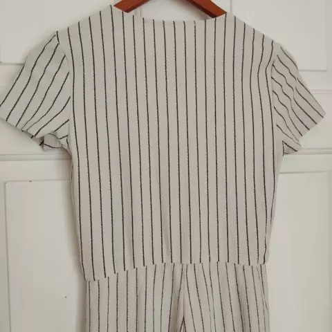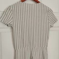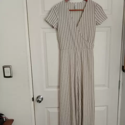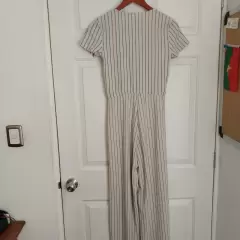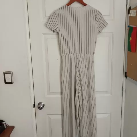 Jumpsuit cuello en V. El jumpsuit es de pierna ancha. En la cintura tiene resorte. Tiene rayas muy delgadas negras. Nunca lo usé