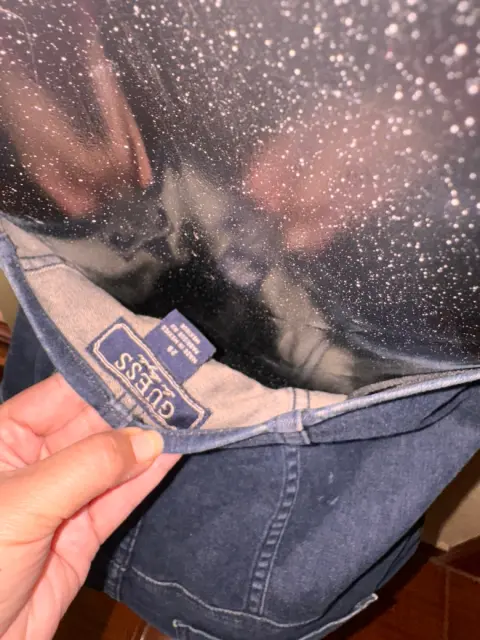 Mezclilla strech, es talla mediana, se ajusta super bonito y no tiene ningún detalle