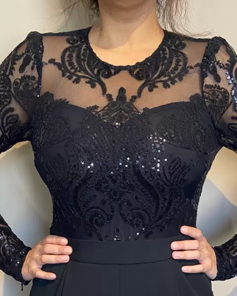 Jumpsuit negro. No es tan largo, las mangas quedan divinos.