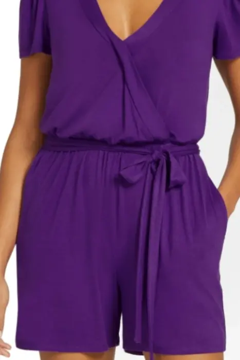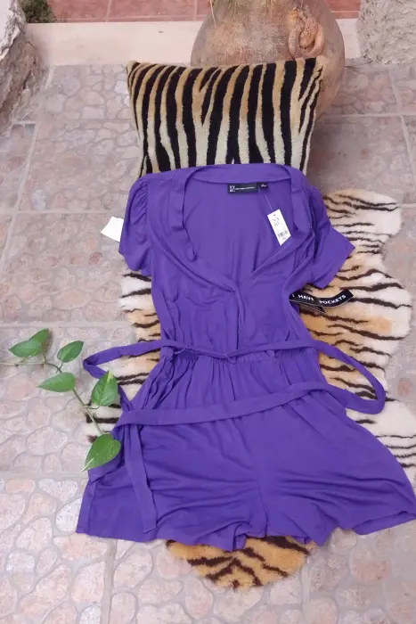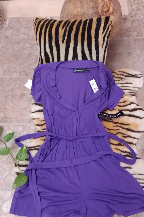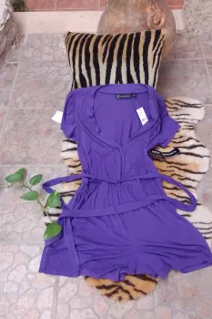 Hermoso jumpsuit-short de tela de algodón, muy suave el diseño es cruzado en el frente con mangas cortas con pinzas.
