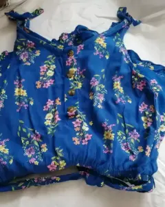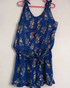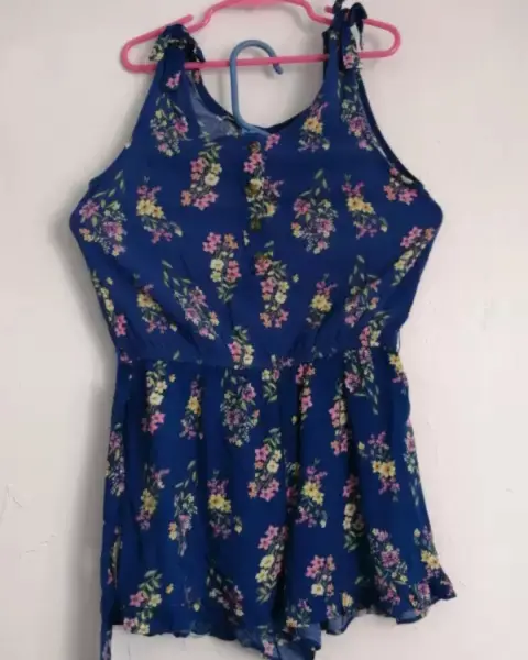 Jumpsuits de short y tirantes color azul con flores muy cómodo, resorte y cinturón de la misma tela con olanes en el short.Los tirantes tienen forma de moño