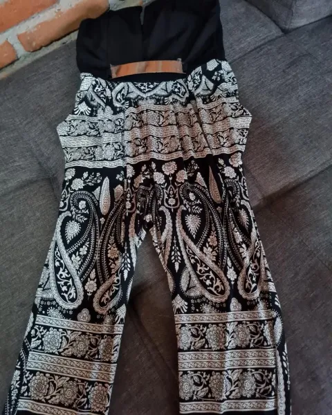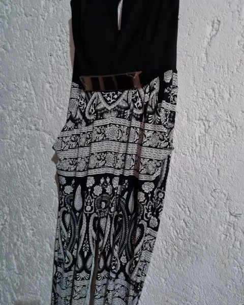 Hermoso Jumpsuits estampado, straple en top negro pantalon estampado