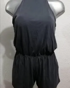 Hermoso jump corto con resorte en la cintura para un ajuste perfecto, color gris oxford, cuello tipo halter, tela 65%modal 35% poliester, al tacto se siente como tela tipo durazno.Medidas largo 79 cm, largo peto 49 cm, largo short 30, Contorno cintura 66,axila a axila 39 cm