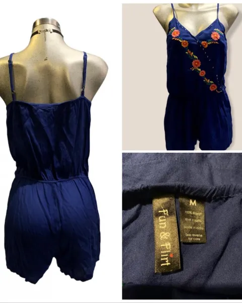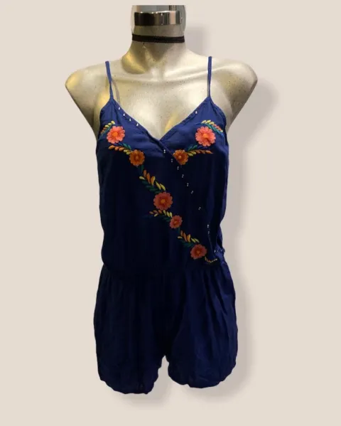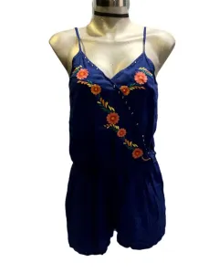Mono de tirantes marca fun&flirt talla mediana cuello en v con bordado de flores y skakira tiene bolsas a los lados con un largo de 82cm entre axila 49cm axila 25cm cintura de 36cm estira a 50cm de axila abajo 57cm súper fresco