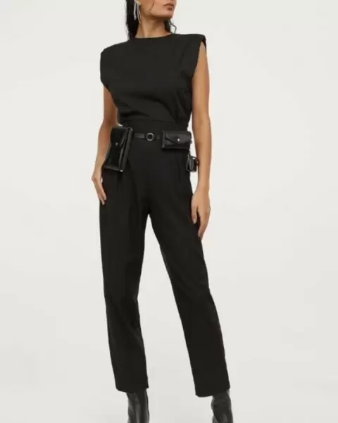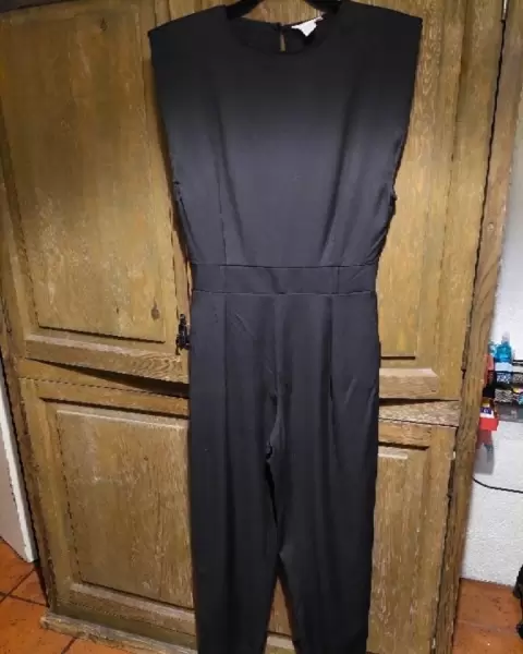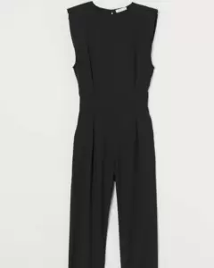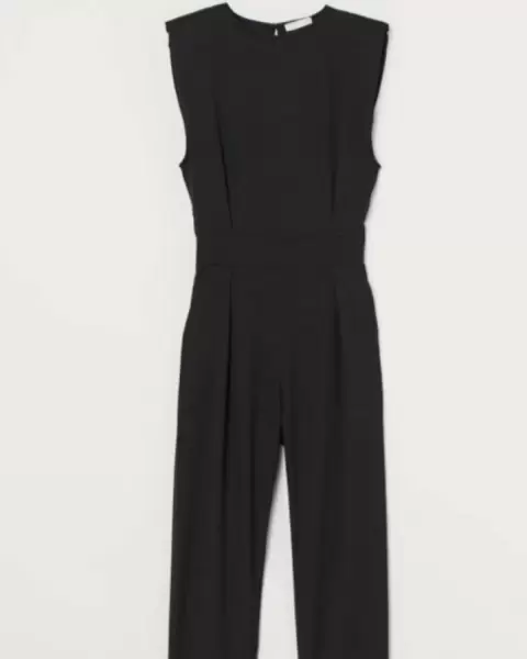 MONO Nuevo H&M. Mono tobillero sin mangas en sarga de mezcla de viscosa. Modelo con hombreras, cintura marcada inspirada en los 80 y abertura pronunciada detrás con botón oculto en espalda y nuca. Elástico en la parte posterior de la pretina, trabillas en la cintura, bolsillos al bies y perneras pitillo con pinzas. Cremallera oculta en la espalda.ComposiciónPoliéster 68%, Viscosa 31%, Elastano 1%