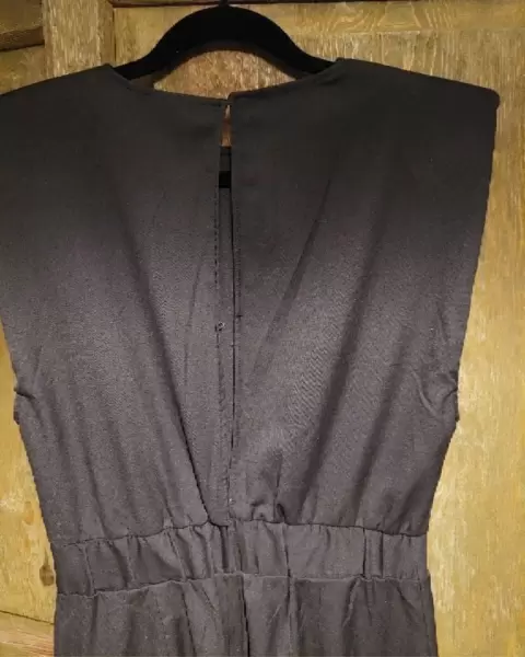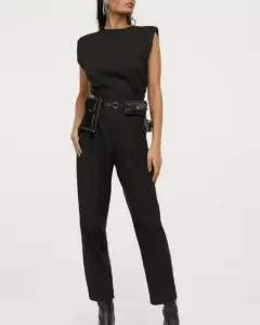 Mono tobillero sin mangas en sarga de mezcla de viscosa. Modelo con hombreras, cintura marcada inspirada en los 80 y abertura pronunciada detrás con botón oculto en espalda y nuca. Elástico en la parte posterior de la pretina, trabillas en la cintura, bolsillos al bies y perneras pitillo con pinzas. Cremallera oculta en la espalda.ComposiciónPoliéster 68%, Viscosa 31%, Elastano 1%