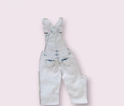 Overol jenss. Overol blanco con desgarre de diseño , bolsillos traceros y delanteros . Con bolsa en la parte delante del pecho .