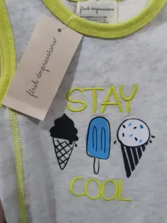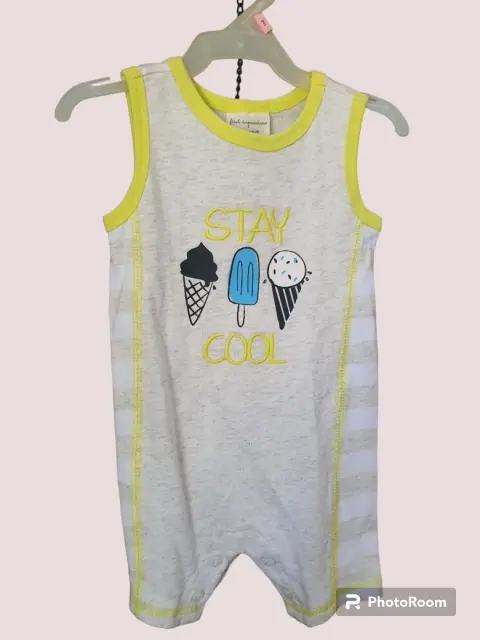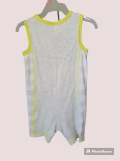Pañalero sin manga. Pañalero de bebé de 0-3 meses, marca First Impressions. Tonos de grises con color limón.