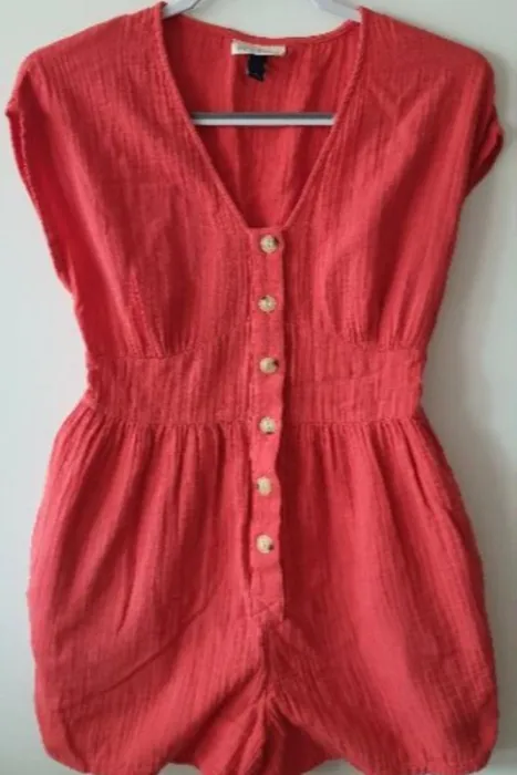 Romper Corto Coral Universal Threads. Romper corto color naranja coral.La tela es 100% algodón.Entallado de la cintura y tiene botonesen la parte de enfrente. Tiene bolsas.Talla XS. Medidas aproximadas: 39cm de axila a axila,34cm de cintura, 72cm de largo desde el hombro.*TODAS MIS PRENDAS SE DESINFECTAN CON LYSOLLAVANDERIA PARA TU MAYOR TRANQUILIDAD*