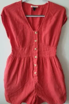 Romper corto color naranja coral.La tela es 100% algodón.Entallado de la cintura y tiene botonesen la parte de enfrente. Tiene bolsas.Talla XS. Medidas aproximadas: 39cm de axila a axila,34cm de cintura, 72cm de largo desde el hombro.*TODAS MIS PRENDAS SE DESINFECTAN CON LYSOLLAVANDERIA PARA TU MAYOR TRANQUILIDAD*