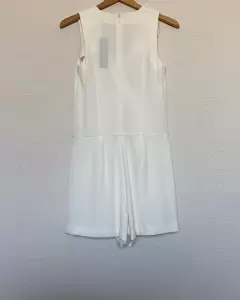 Es un romper que por atrás es short y adelante es vestido, se abrocha con cierre atrás, adelante es cuello V envolvente, sin mangas, es color crudo