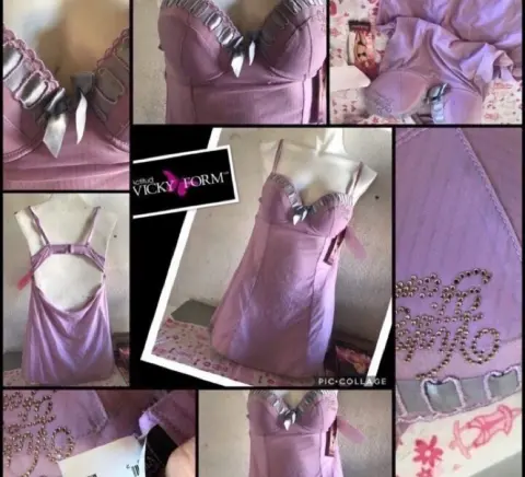 Baby doll. Delicado en cada detalle en lila con líneas gris muy tenues y listón en copa preformada y varilla, escote y broche en espalda. También disponible en XL y M