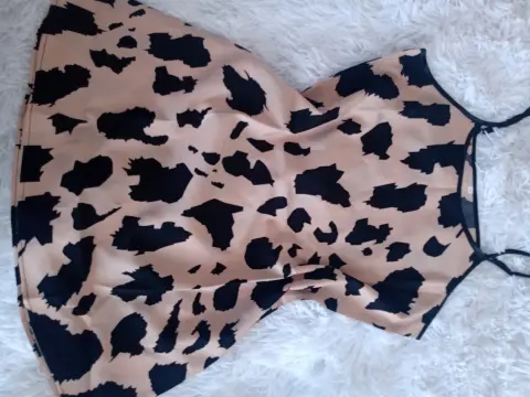 Hermoso baby doll, en tono beige con manchitas negras, la tela es satinada y las mangas de tirantes ajustables.