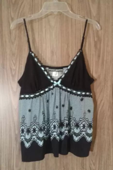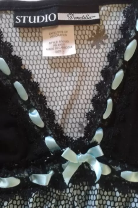 Baby doll Studio Donatella. Sexy Baby Doll .Color Azul cielo con negroTalla LHecho en CambodiaListòn y encaje en contorno al busto.(en la parte de abajo donde esta el color azul es como impresa la tela con efecto encaje pero eso la hace durable a diferencia del tul).Con tirantes ajustable.90%Polyester 10% Spandex.En muy perfectas condiciones .Y te esta esperando.