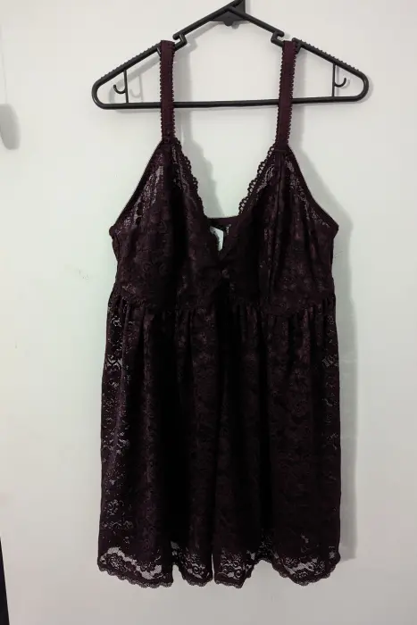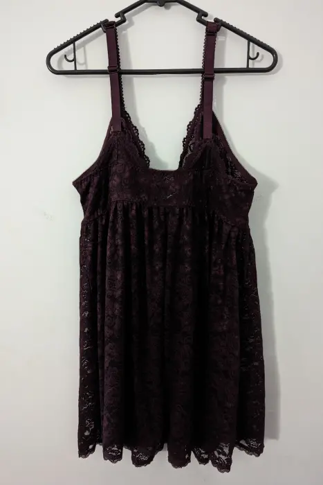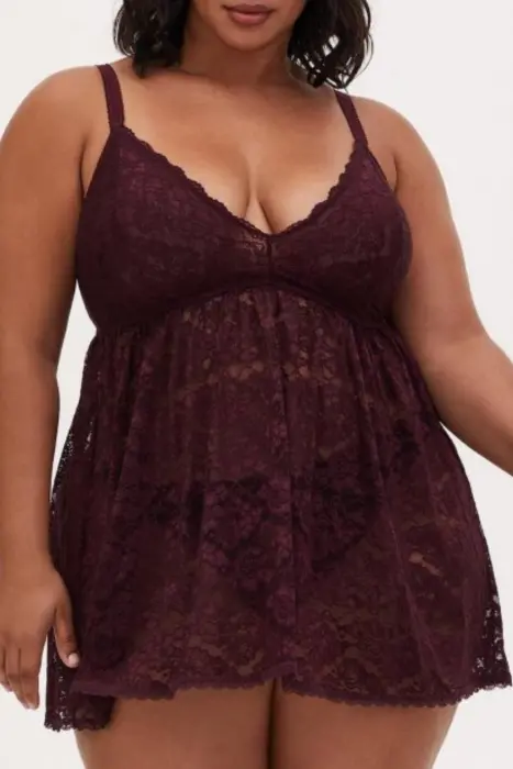 Babydoll Vino. Este sensual babydoll de encaje rojo vino hará volar a tu pareja y te mantendrá cómoda. De encaje floral integral, el estilo semitransparente es muy favorecedor, con un corte que lo mantiene ceñido en la parte superior y acampanado en la inferior. NO incluye tanga.