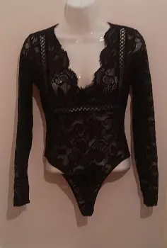 Bonito body negro, semitransparente, talla S-M, en buen estado, solo tiene algunos detalles derivados del uso ( algunos hilos un poco jalados), pero en general tiene buena vida útil aún
