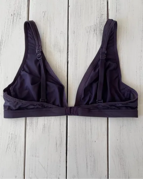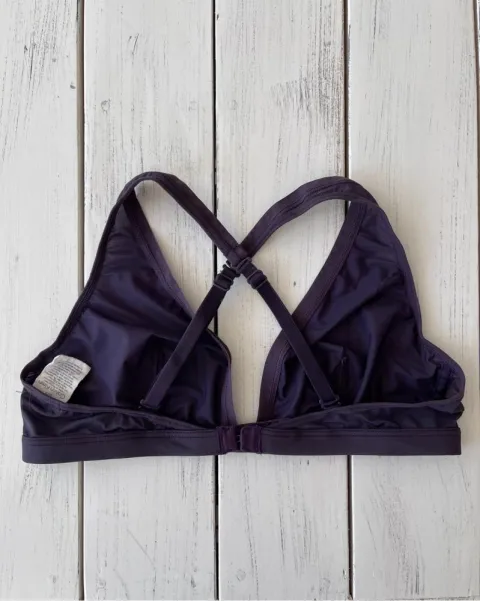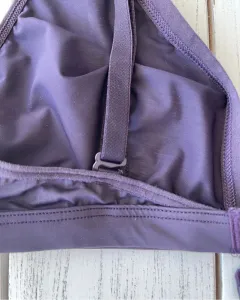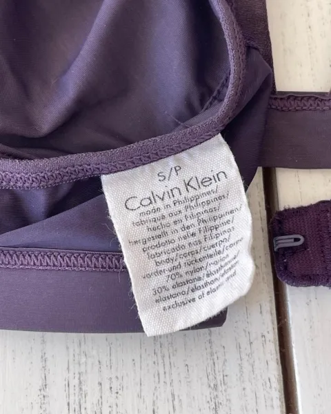 Bra morado Calvin Klein. Talla: S/P, los tirantes se pueden cruzar en la espalda. Tela delgada y fresca. 70% nylon y 30 elastano. Mide de 30 a 33 cm. No tiene más detalles que el color no es el mismo que cuando se compró.