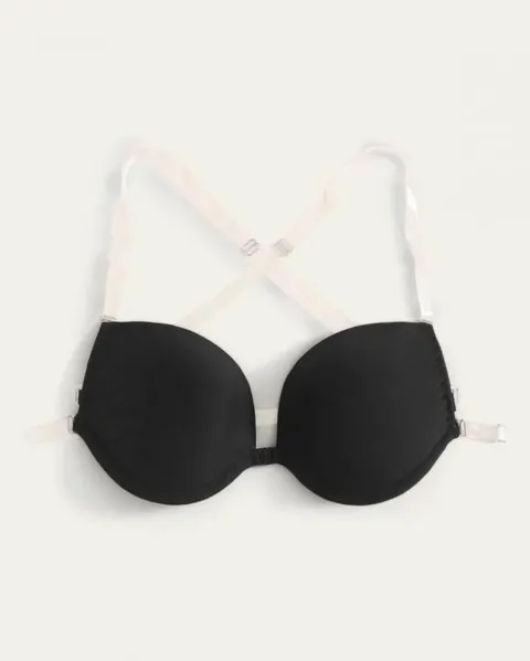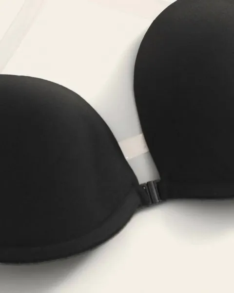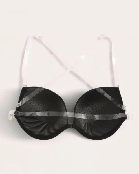Bra sin espalda, trae tirantes transparenstes para ajustar la parte de la esplada. (3 en total), el broche es por enfrente, lo cual hace un efecto push-up. Medidas: pecho 94 cm. Largo 17.5 cm.