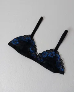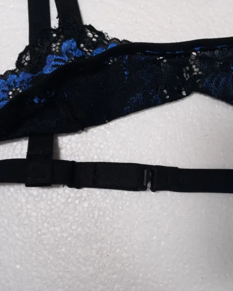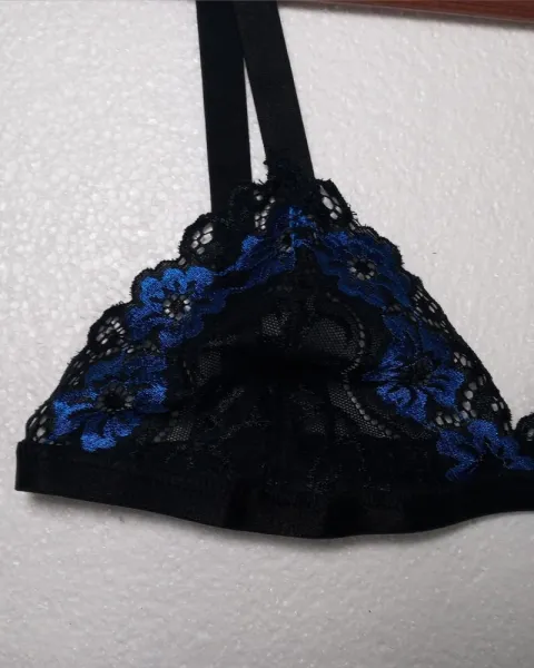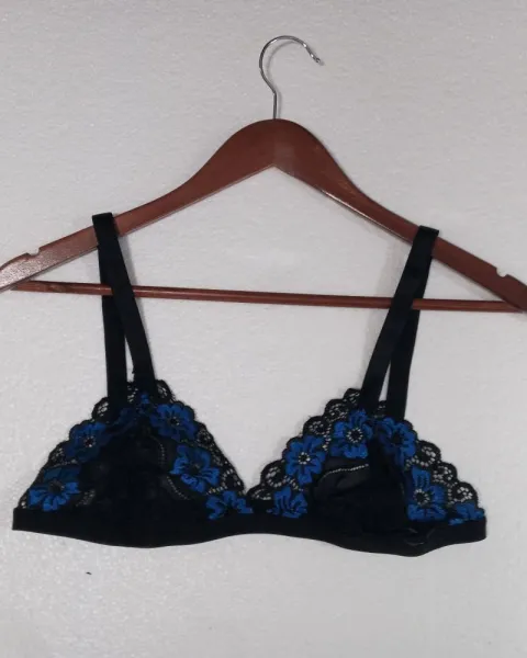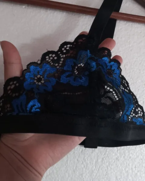 Bralette encaje negro con flores azules. Padrisimo bralette negro con encaje azul.Sin relleno ni varillaTe interesa otra talla ?Manejo copas b a ddY tallaje de 32 a 40 .Envio discreto.