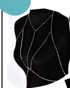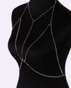 Hermoso y moderno accesorio tipo brasier.Con pedrería tipo diamante, tiene broches ajustables.Usalo con un bikini, con escote, o sin ropa para una noche de pasión :)La imagen es una referencia de cómo puedes usarlo.Color PLATA¡Gracias por visitar mi closet!
