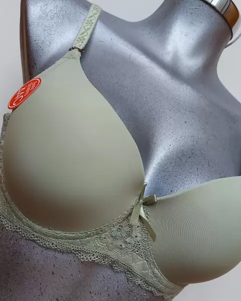 Coordinado bra verde olivo. Conjunto de bra y panties color verde olivo claro, viene etiquetado talla 44C pero viene reducido, le queda a una talla 40c. Es verde olivo claro, tiene varillas!