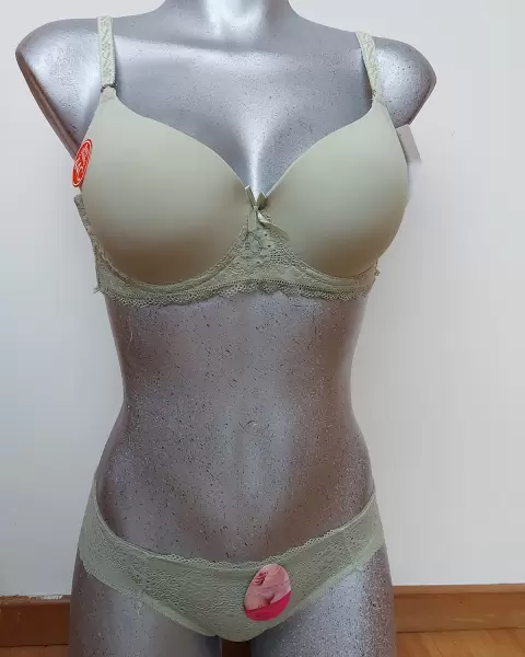 Conjunto de bra y panties color verde olivo claro, viene etiquetado talla 44C pero viene reducido, le queda a una talla 40c. Es verde olivo claro, tiene varillas!
