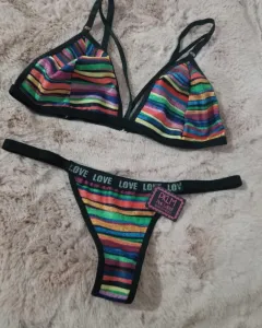 Padrísimo coordinado de bralette y tanga multicolor completamente nuevo de diseño único queda a talla S y M y el bra a 32, 34 y 36B. La tela está padrisima y muy cómodo. Animate aceptó ofertas!!