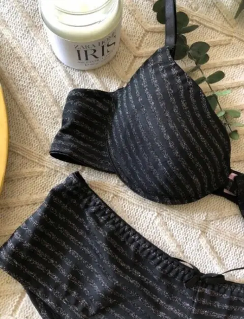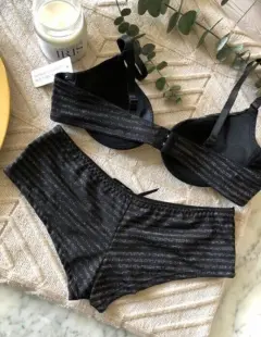 Bra y Hipster Marca Native Intimates. La tela tiene rayas metalizadas. Muy Lindo. Ligero Push Up en las copas. Varilla. Talla 36B y Hipster en M.El Bra se usó sólo una vez.