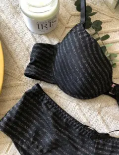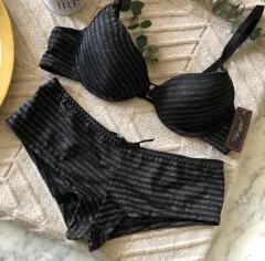 Coordinado con Bra Push Up. Bra y Hipster Marca Native Intimates. La tela tiene rayas metalizadas. Muy Lindo. Ligero Push Up en las copas. Varilla. Talla 36B y Hipster en M.El Bra se usó sólo una vez.